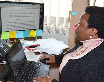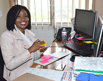 Mwamusi is always covered by a mountain of admin but she handles it with a smile. Of course, sticky note reminders don’t hurt either. |