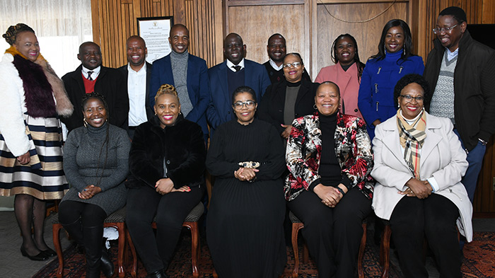 Back, from left: Dr Phumzile Dlamini, Acting Executive Director, Human Resources; Dr Azwinndini Tshivhase: Executive Director, Academic Planning; Mr Feresane Sibeko: Executive Director, University Estates; Prof Mpho Ngoepe: Executive Director, Library and Information Services; Mr Ayanda Noma: Director, Innovation, Technology Transfer and Commercialisation; Mr Frankie Mojapelo: Director, Unisa Foundation & Alumni; Dr Matseliso Molapo: Executive Director: Institutional Intelligence; Ms Nolwazi Mwabi: Director, Communication, Marketing & Events; Dr Phumza Makgato-Khunou: Director, Instructional Support and Services; and Prof Lumkile Lalendle: Executive Director, Planning and Quality Assurance