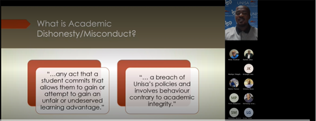 The CAS Acting Head of Quality Assurance, Mlungisi Hlongoane, gave a presentation on Academic Integrity (AI). "Academic dishonesty/misconduct is a breach of Unisa's policies and involves behaviour contrary to academic integrity; please do not be tempted by service providers who offer their services to help you with assignments or examinations," he stressed.