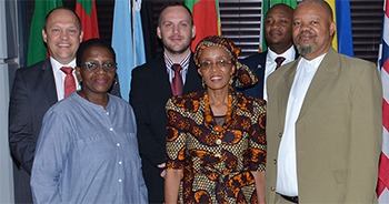 At the launch of the first Classification of Media Content Programme in Africa: Back: Prof Deon Tustin (Head: BMR, Unisa), Regardt Gouws (Acting CEO: FPB), Tshegofatso Kgarabjang (Director: Legal Services, Department of Communication), and, front, Prof Rushiela Songca (ED: CLAW, Unisa), Thoko Mpumlwana (Council Chairperson:FPB), and Prof Mandla Makhanya (Principal and Vice-Chancellor, Unisa).