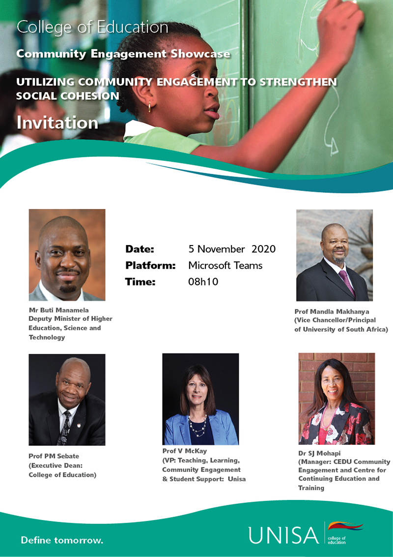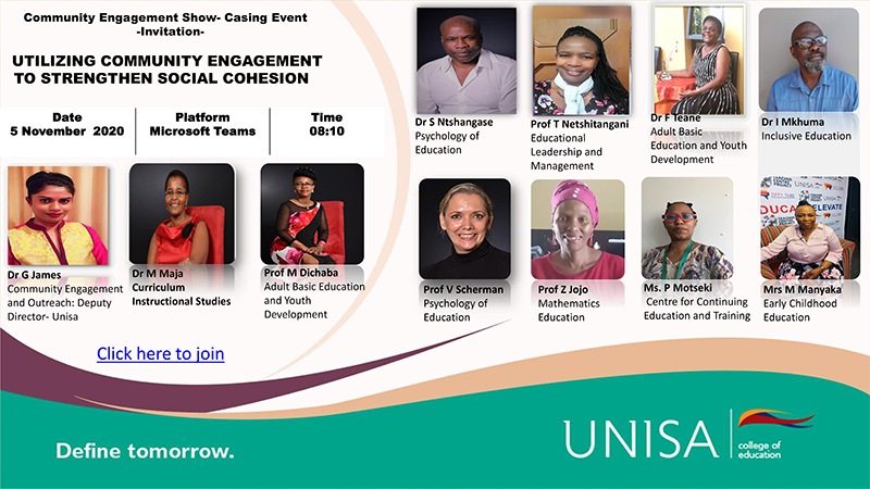 Unisa’s College of Education (CEDU) hosted its inaugural community engagement (CE) showcase event on 5 November 2020.