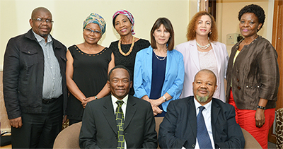 Back, Linky Tsiane, Prof Nkidi Phatudi (CoD: Early Childhood Education), Dr Soane Mohapi (Manager: Centre of Continuing Education and Training, Unisa), Prof Veronica McKay (Executive Dean: College of Education), Dr Andriena Malgas (Head: ECD, MGSLG), and Prof Pinkie Mabunda (School Director: School of Teacher Education), and, front, Dr More Chakane (CEO: MGSLG), and Prof. Mandla Makhanya (Principal and Vice-Chancellor, Unisa)