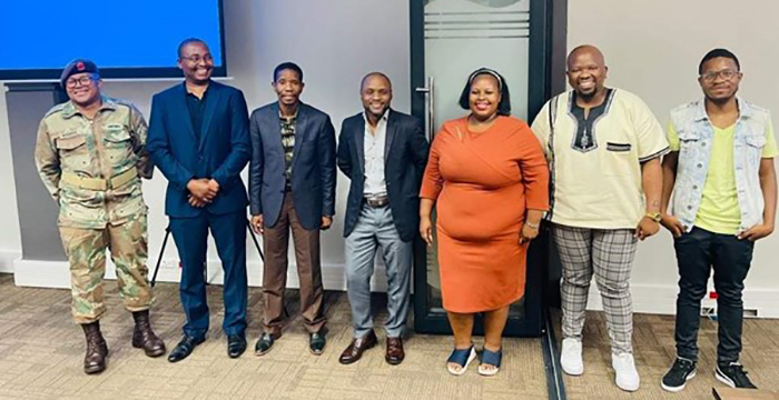 From left: Major Andries Moekoa (SANDF), Prof Angelo Dube (Acting Manager, Office of Strategic Projects), Dr L Morodi (Director, School of Criminal Justice), Mr Lunga Dweba (Conflict and Forced Migration Research Institute), Ms Thembisile Mahuwa (Unisa Law Clinic), Mr Sikelela Ndlazi (PCILAW) and Mr Tendani Musekwa (Student assistant at PCILAW and LLB candidate, Unisa)