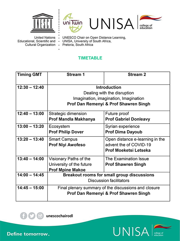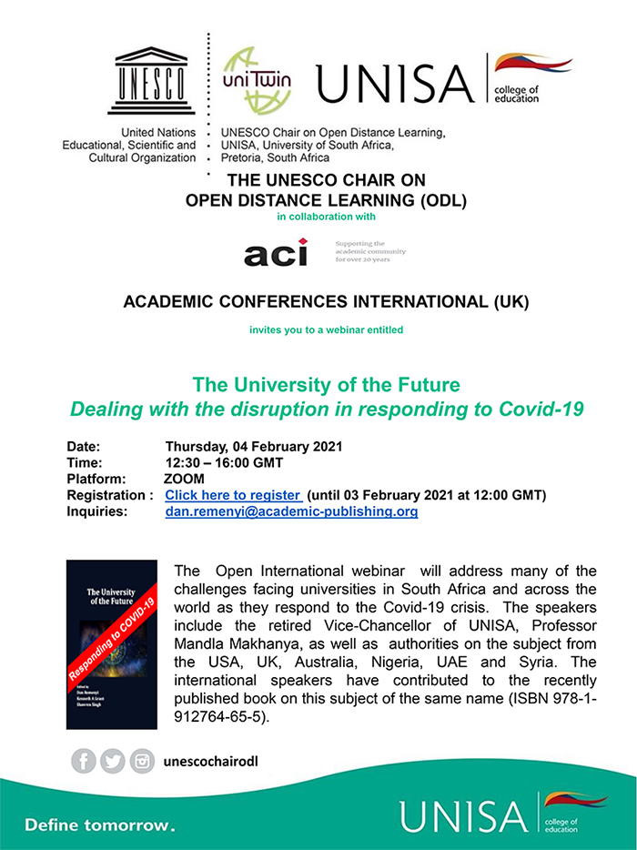 The UNESCO Chair of Open Distance Learning at Unisa and the United Kingdom’s Academic Conferences International (ACI) held a webinar on 4 February 2021 entitled "The university of the future: Dealing with the disruption in responding to Covid-19". The international speakers have contributed to the recently published book on this same topic.