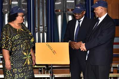 Mandela family representative Ndileka Mandela, Prof Mandla Makhanya (Unisa Principal and Vice-Chancellor) and Busani Ngcaweni (Deputy Chairperson of the Unisa Council) |