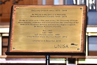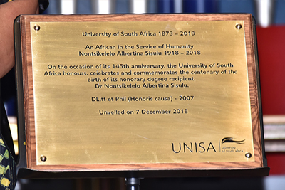 On Friday 7 December 2018, the University of South Africa (Unisa) unveiled commemorative plaques honouring the centenary of the births of Nelson Mandela and Albertina Sisulu. The centenary coincides with the institution’s 145thanniversary as a beacon of hope on the continent and beyond.