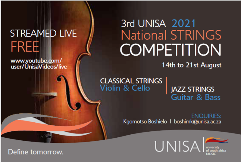The requirements and procedures for the competition will correspond closely to the requirements and procedures for the sixth Unisa International Strings Competition, which will take place in 2022.