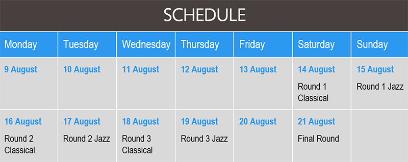 The competition starts with round 1 of the classical category on Saturday, 14 August 2021, followed by round 1 of the jazz category on the following day, and culminating in the final round and award ceremony on 21 August.