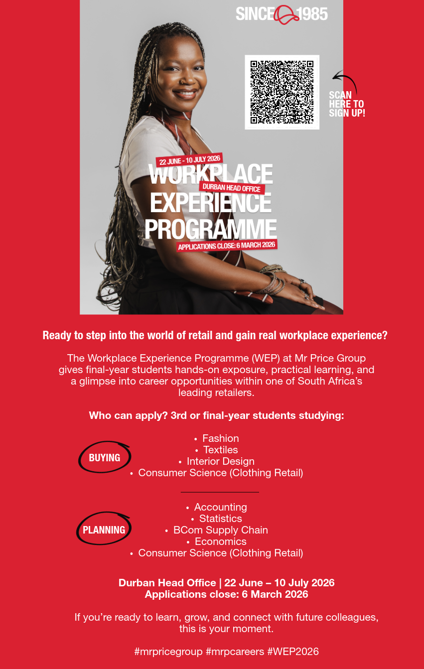 - Final year students in the following fields are invited to apply for the Mr Price Group Work Experience Programme: Consumer Science, Fashion, Accounting, Statistics, BCom Supply Chain Management, and Economics. The closing date is 6 March 2026. Please visit the Mr Price Group careers page for more details and to apply. Click here for the poster.