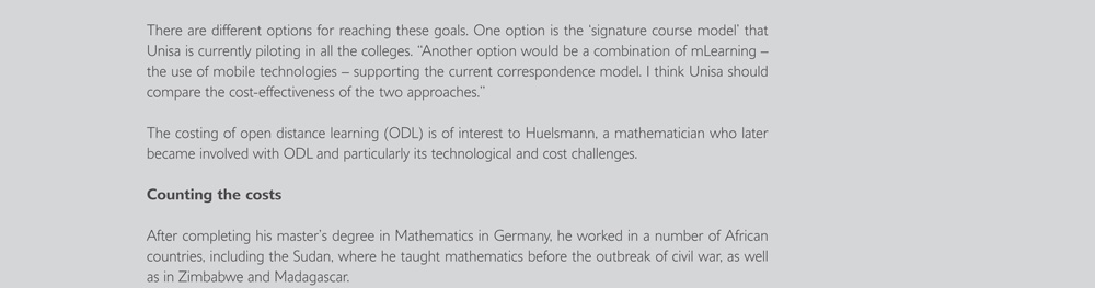 Niche area 1: Knowledge generation and human capital development in response to the needs of Africa Niche area 2: The promotion of democracy, human rights and responsible citizenship Niche area 3: Innovation and capacity building science and technology Niche area 4: Economic and environmental sustainability Niche area 5: Open distance learning